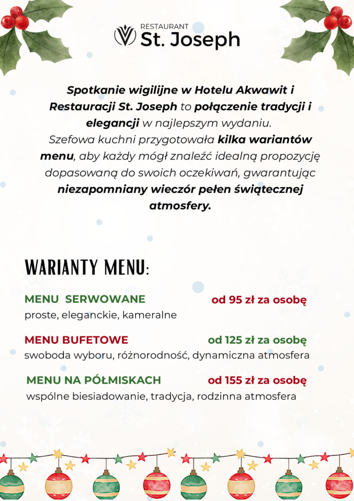 Wigilijne smaki, piękna oprawa i profesjonalna obsługa tworzą niezapomniany wieczór. Zapraszamy do rezerwacji i wspólnego świętowania.